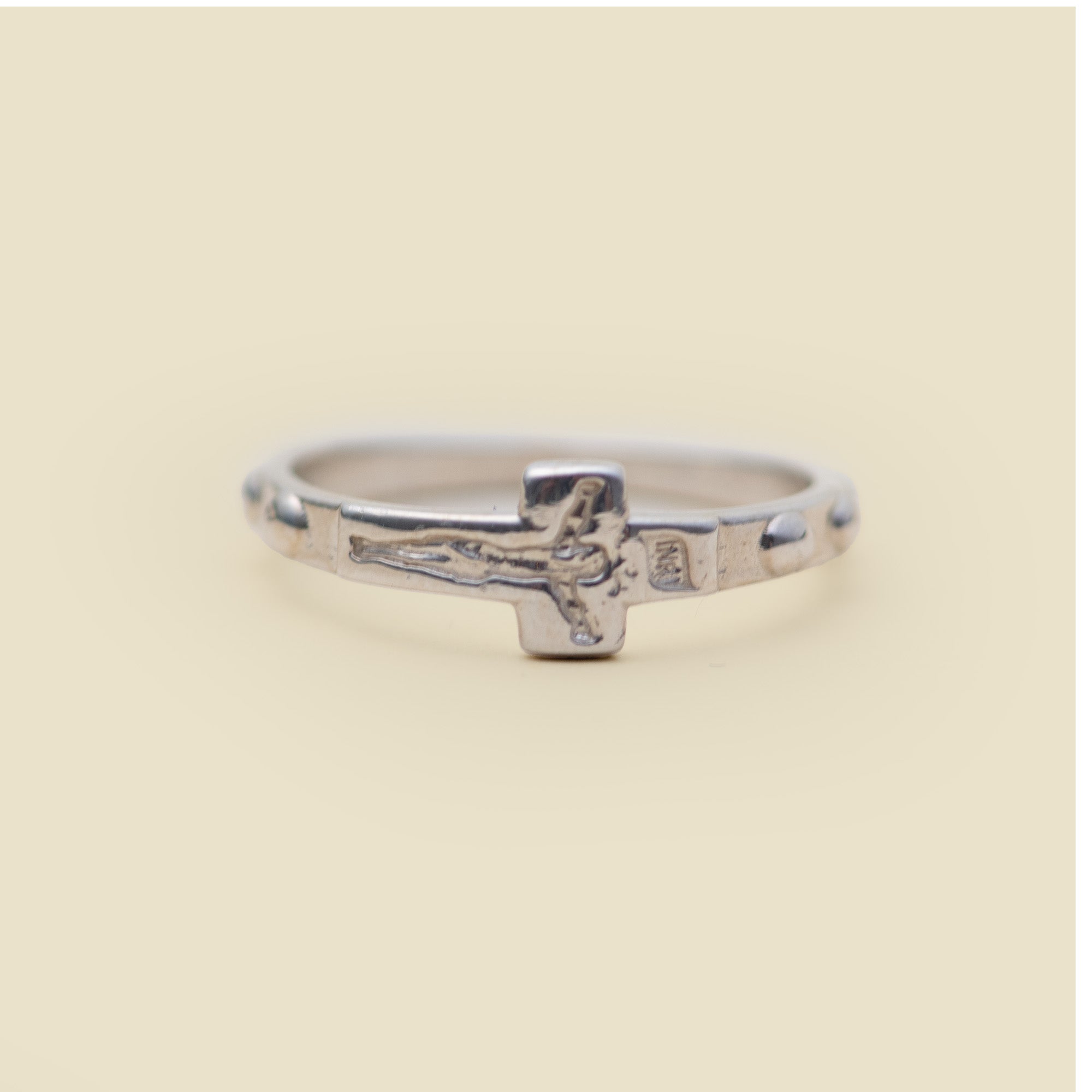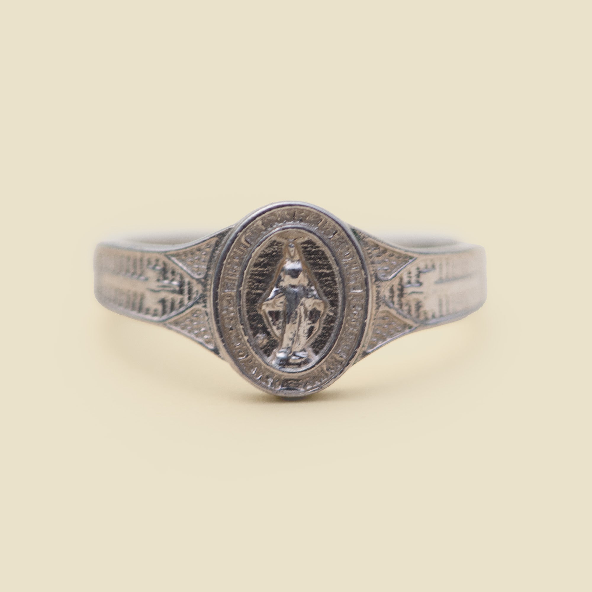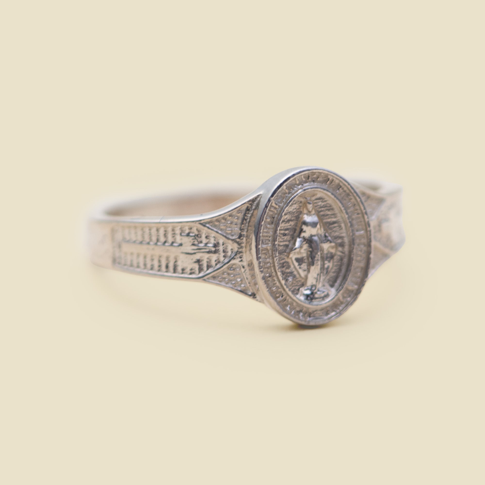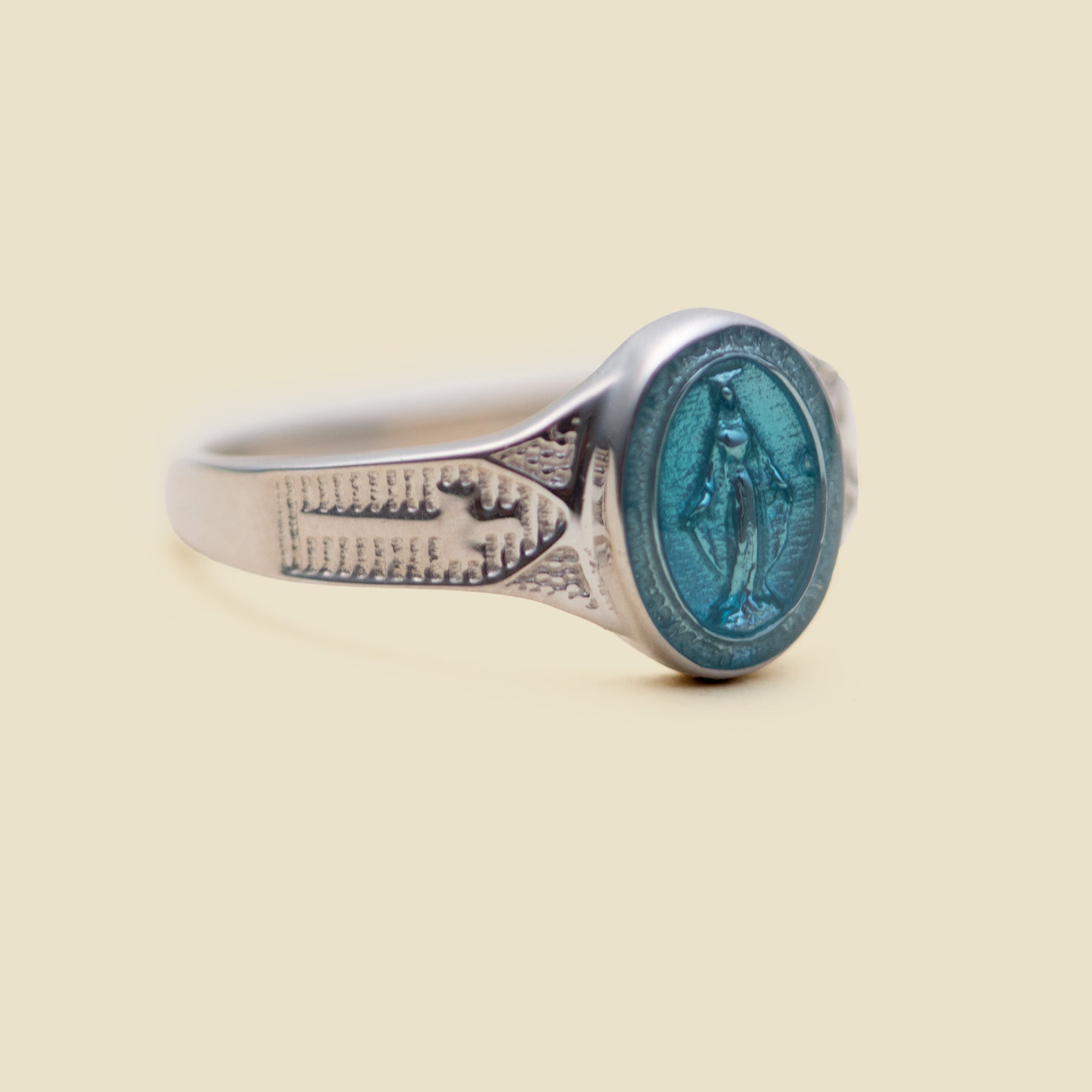 Large Sterling Silver Miraculous Medal Ring with Blue Accent